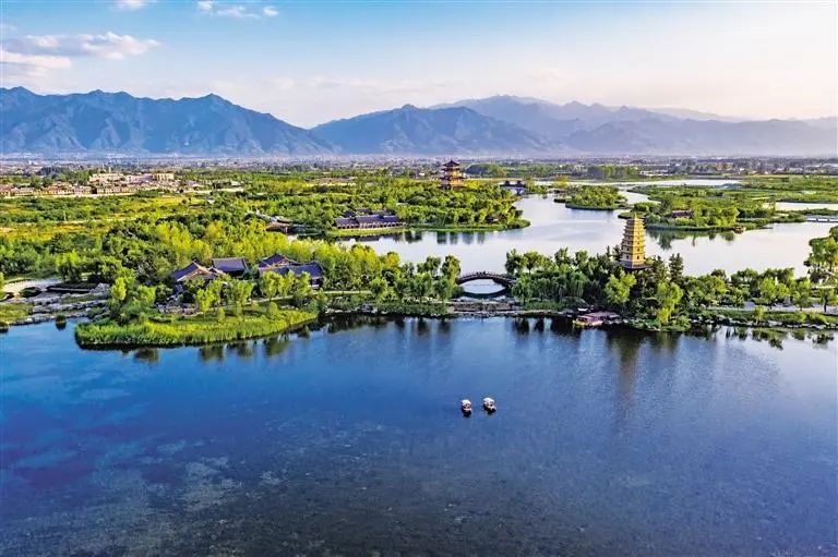 7月7日,航拍夏日的渼陂湖。位于西安市鄠邑區(qū)的渼陂湖是秦漢上林苑、唐代游覽勝地,有“關(guān)中山水最佳處”的美譽。近年來,重新修復(fù)后的渼陂湖恢復(fù)了渼陂泛舟、杜堤三橋、空翠野煙等渼陂八景,使周邊地區(qū)自然生態(tài)環(huán)境得到改善。陜西日報記者 袁景智攝
